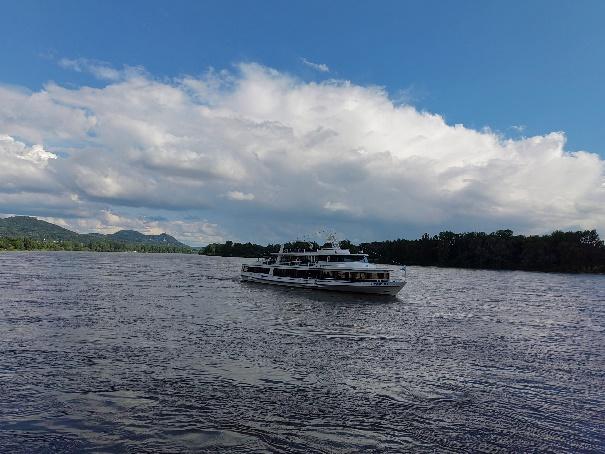 为了保护自然风景的原貌,原来的莱茵河河谷段没有架设桥梁,往来两岸都靠轮渡。两岸风景有点像中国的三峡,但山没有三峡的高、陡。沿河两岸山坡上遍布葡萄园,点缀着无数罗马时代的古堡。