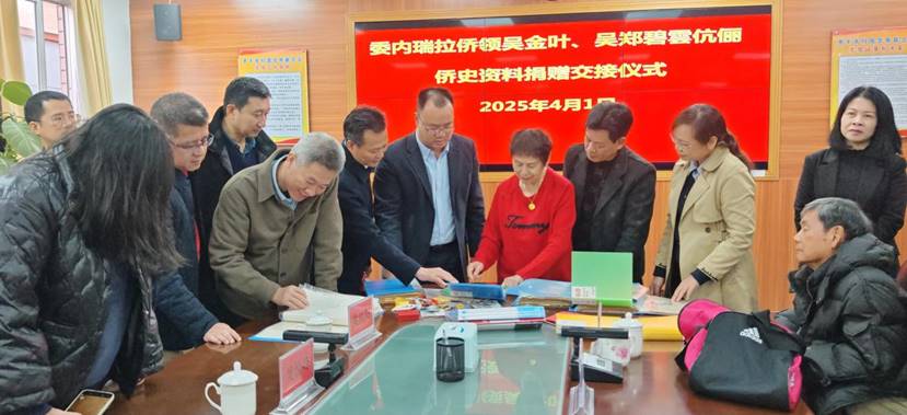 图为吴金叶、吴郑碧云伉俪(左8、9)向家乡捐赠侨史文献