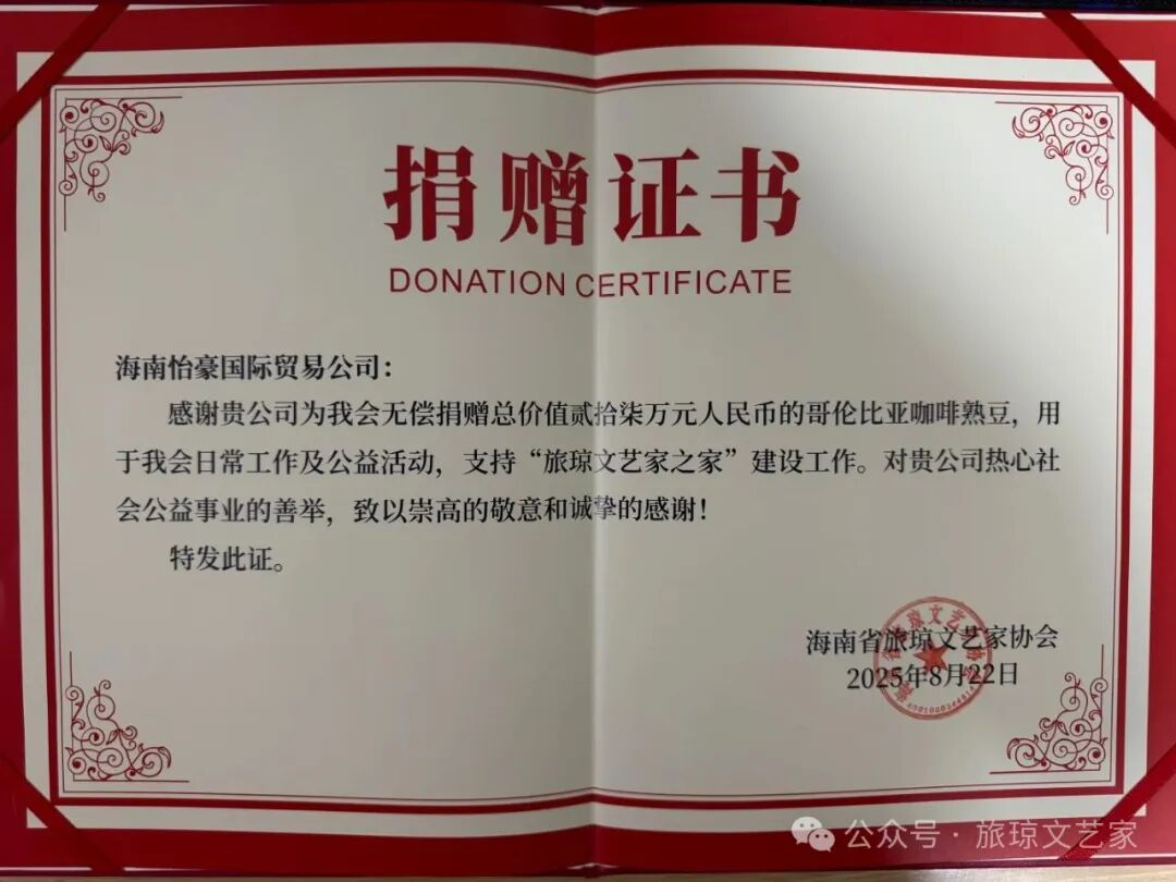 据悉,付豪总经理一直以来积极践行社会责任,展现出新时代企业家的担当精神。在新冠疫情期间,他第一时间响应抗疫号召:2021年12月及2022年1月,通过陕西欧美同学会向西安市莲湖区疫情防控指挥部累计捐赠价值1万元抗疫物资;2022年8月,代表怡豪珠宝及中泰卓越建设公司向海南省侨联和红十字会捐赠价值14万元抗疫物资,并获得红十字会颁发的捐赠证书。2024年3月,公司向海南省侨爱基金会捐赠价值31万余元的哥伦比亚咖啡;2025年,又相继向全球贸易之窗和此次海南省旅琼文艺家协会捐赠咖啡豆,总价值达49.8万元。据统计,其个人及企业各类捐赠总价值已超过100万元,这些善举充分体现了他"取之于社会,用之于社会"的经营理念和高度的社会责任感。