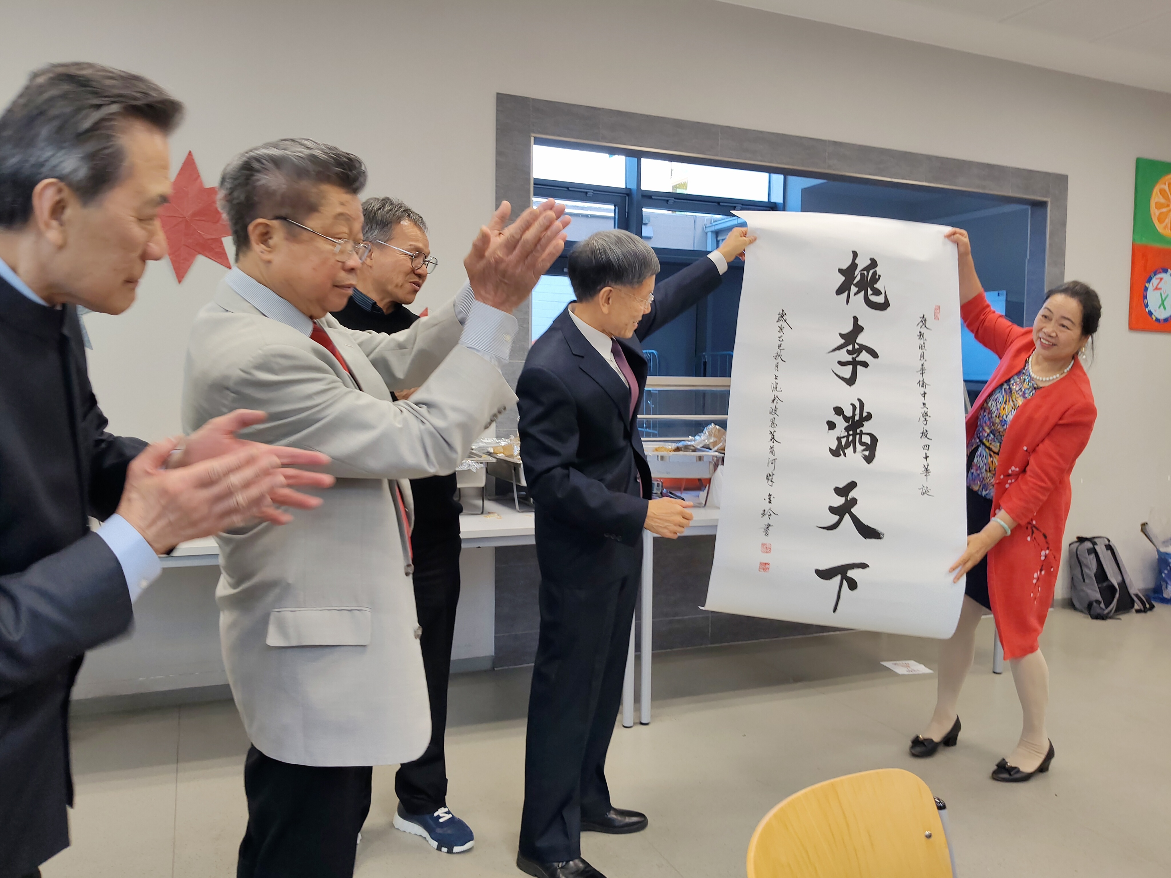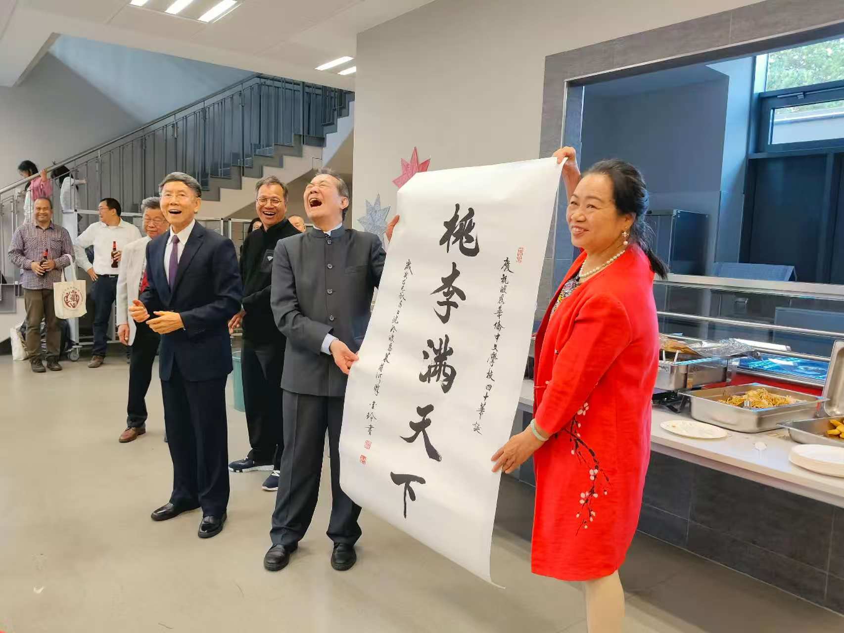本网讯:2025年9月27日上午,波恩中文学校40周年校庆活动如期举行,为了丰富校庆活动内容,金玲老师书法展成功举办,参与校庆活动的领导与嘉宾饶有兴趣参观了书法展,波恩中文学校前任几位老校长及现任卢康乐校长、中国驻杜塞尔多夫总领事余勇先生, 波恩副市长翁特尔泽和德国合作学校的校长等也莅临会场参观了书法展给予好评,并与金玲老师合影留念。