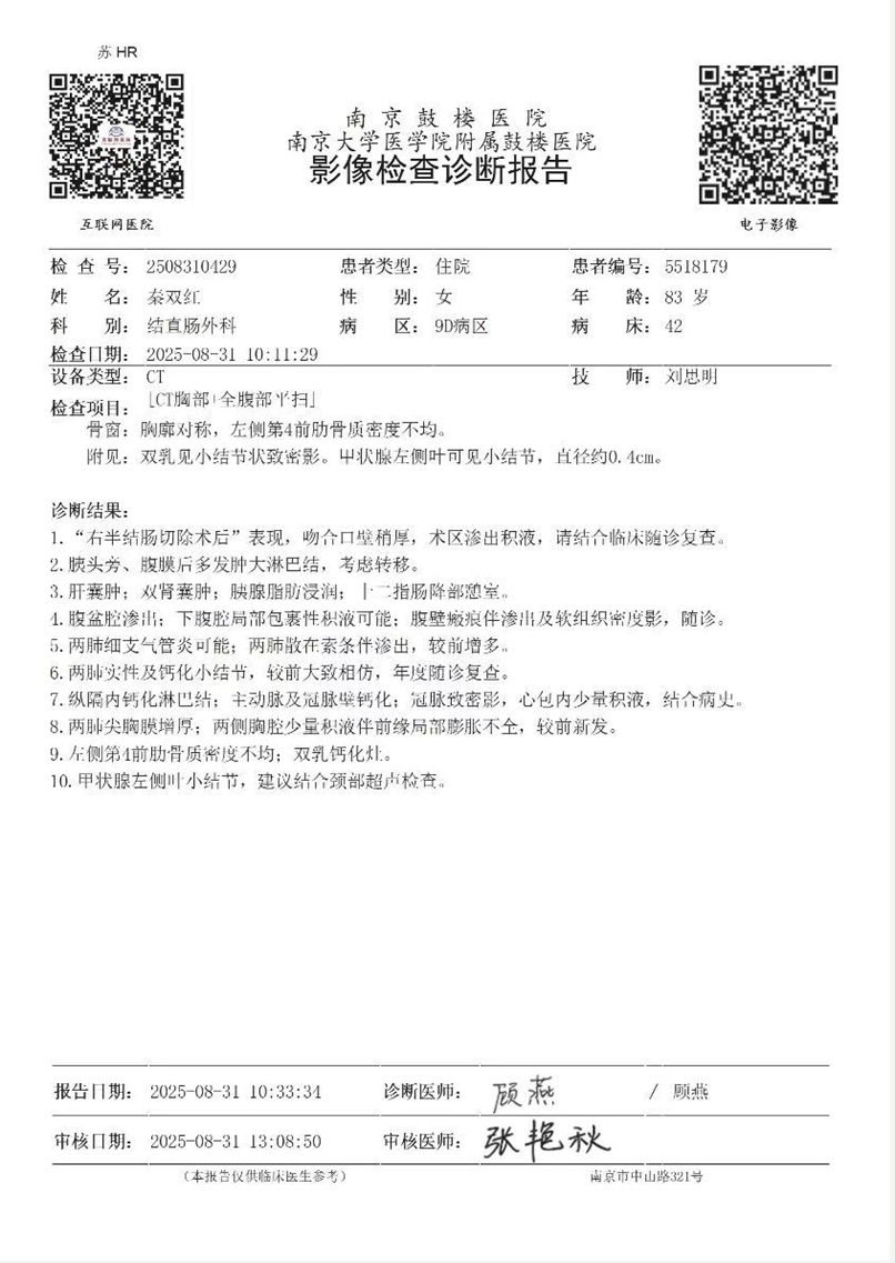 时间退至 2025年8月20日,虽然身患疑似直肠癌但身体状态一直表现良好的秦双红在家属陪伴下来到南京一所有着三甲医院资质著名的鼓楼医院求诊。经该院结直肠外科名叫朱兴亚主任医生诊断条件符合便作了肿瘤切除手术,手术完成后,朱医生跟秦双红家属表示手术很成功,称患者不出几日便可出院回家静养。同月30日,朱兴亚医生以“医院不是疗养院,病床紧张”为由强迫患者家属立刻办理出院,而在此前,患者体温高达 38.7度以上且伤口处有大量化脓状况,负责患者病情管理的朱医生对此不是让人草草处理就是有时杳无音讯。9月18日,当患者体温时有发烧、C反应蛋白一度达到 200 极异常情况下,朱医生还是将患者推转至南京市中心医院。朱医生在“出院记录”清晰记载:情况好转,腹部手术切口良好……,而事实上,患者一直有伤口化脓现象,伴有高温,并出现急性肝衰竭等一系列并发症,病人意识模糊,昏厥。