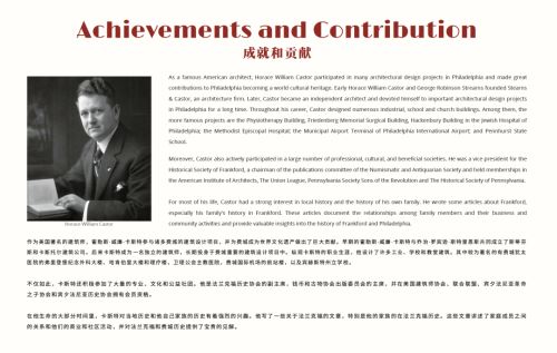 不仅如此,卡斯特还积极参加了大量的专业、文化和公益社团。他是法兰克福历史协会的副主席,钱币和古物协会出版委员会的主席,并在美国建筑师协会、联盟、宾夕法尼亚革命之子协会和宾夕法尼亚历史协会拥有会员资格。