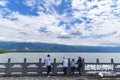 入夏第一场雨过后,运城市千年盐湖在蓝天白云及云雾缭绕中条山的映衬下,显得分外妖娆,宛如一幅美丽画卷。