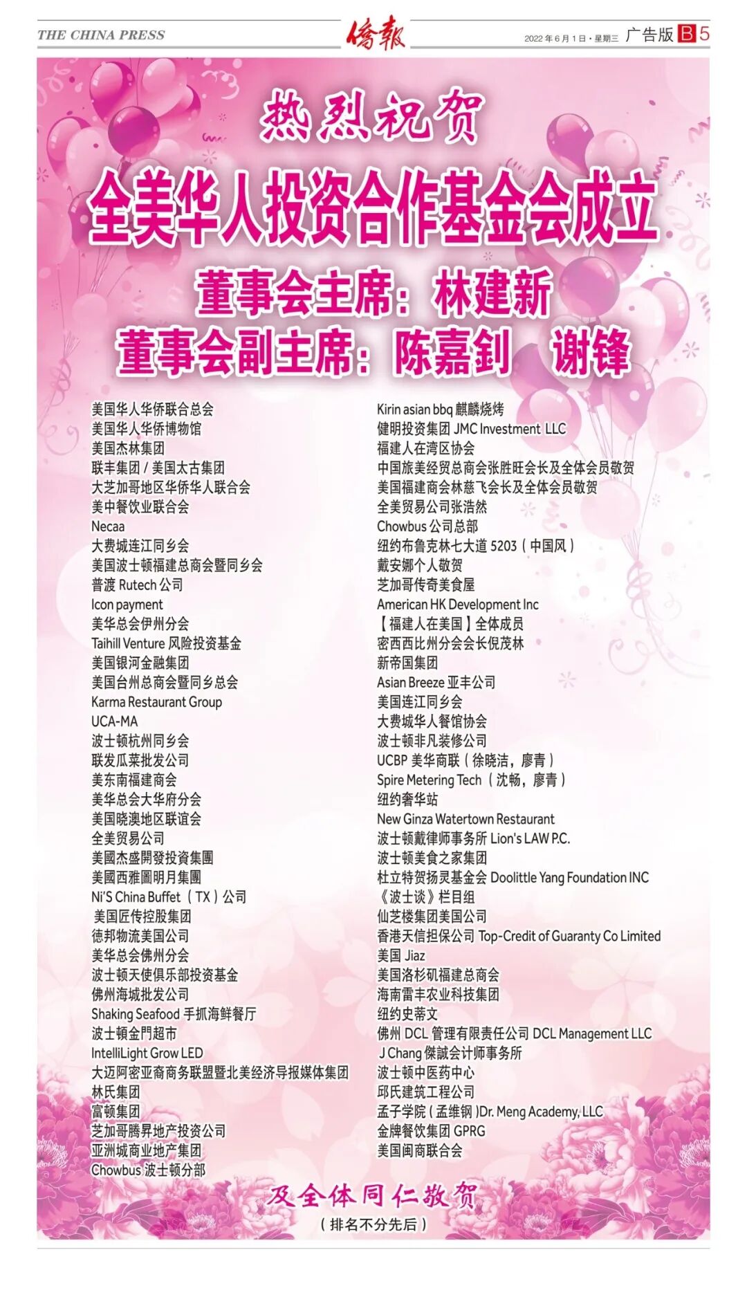 6月1日,“全美华人投资合作基金会”成立大会在麻州波士顿隆重举行。来自全美二十多个州的华裔企业家代表逾150人参加,会议通过决定第一届基金会主席林建新、副主席陈嘉钊、副主席谢锋、监事会主席方慧、秘书长朱立业 ,名誉顾问sunny邱、林建中、林达坚、李建生等董事成员。