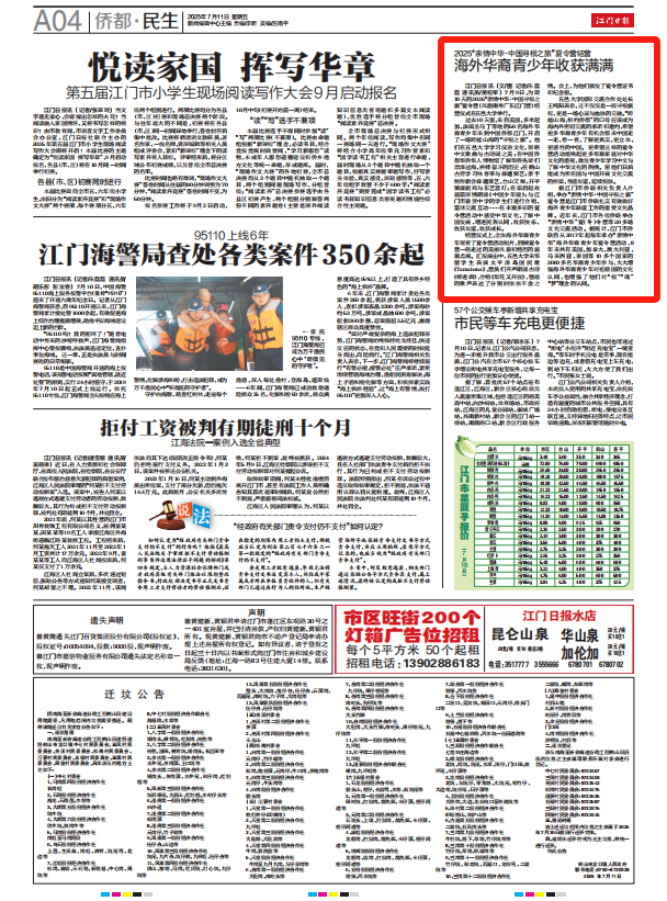《2025“亲情中华·中国寻根之旅”夏令营结营,海外华裔青少年收获满满》一文发表于《江门日报》(2025 年 7 月11日A04版),纸质版图片展示