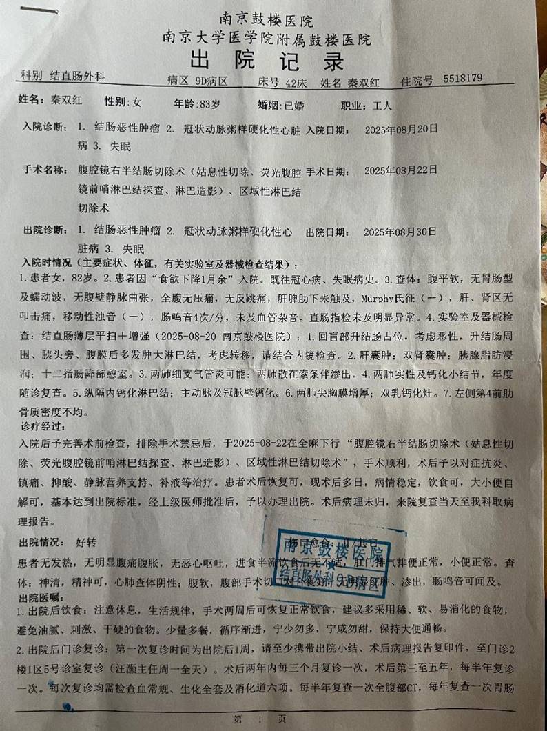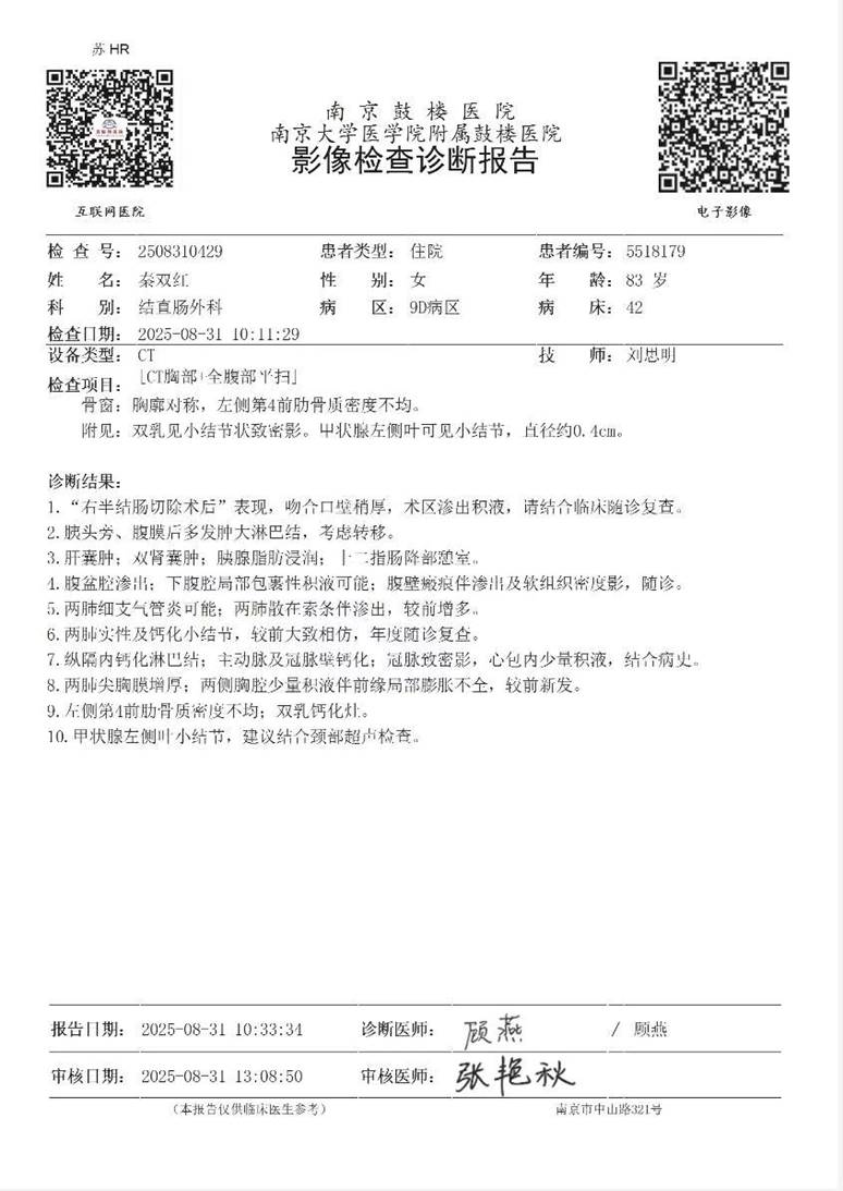 时间退至 2025年8月20日,虽然身患疑似直肠癌但身体状态一直表现良好的秦双红在家属陪伴下来到南京一所有着三甲医院资质著名的鼓楼医院求诊。经该院结直肠外科名叫朱兴亚主任医生诊断条件符合便作了肿瘤切除手术,手术完成后,朱医生跟秦双红家属表示手术很成功,称患者不出几日便可出院回家静养。同月30日,朱兴亚医生以“医院不是疗养院,病床紧张”为由强迫患者家属立刻办理出院,而在此前,患者体温高达 38.7度以上且伤口处有大量化脓状况,负责患者病情管理的朱医生对此不是让人草草处理就是有时杳无音讯。9月18日,当患者体温时有发烧、C反应蛋白一度达到 200 极异常情况下,朱医生还是将患者推转至南京市中心医院。朱医生在“出院记录”清晰记载:情况好转,腹部手术切口良好……,而事实上,患者一直有伤口化脓现象,伴有高温,并出现急性肝衰竭等一系列并发症,病人意识模糊,昏厥。