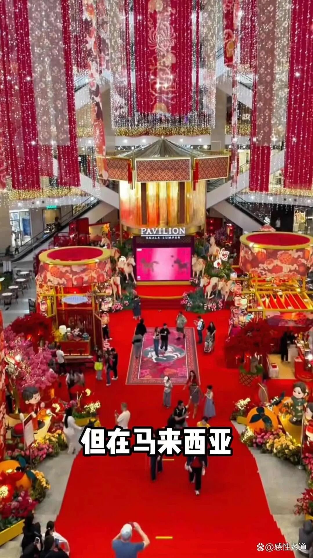 各大商场的新春装饰堪称视觉盛宴。2026马年春节,吉隆坡柏威年广场(Pavilion KL)联名潮流IP打造艺术灯笼展,3D拜年动画在巨型屏幕循环播放,马年限定盲盒快闪店前人头攒动;双威金字塔广场则以“马腾祥瑞”为主题,巨型金马立于走马灯中央,六匹彩马灯饰寓意六六大顺,成为民众打卡合影的热门地标。