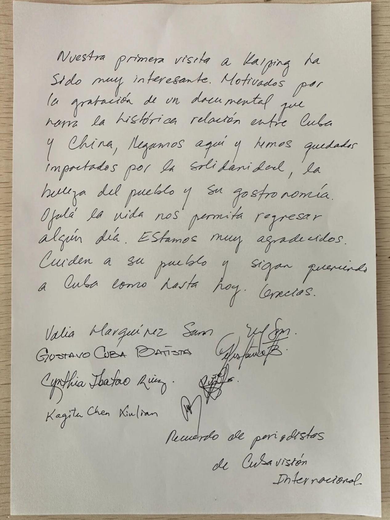 古巴国际电视台记者为开平市百合镇题词留念